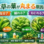 異常として疑いやすいのは、植えてすぐ浮き上がる、数日でぐらつく、根元は細く傷んでいるのに上だけ葉が残る、茎がひょろ長くて自立できない、同じ場所の株ばかり傾く、といった場合です。特に、横へ寝るだけでなく、葉が小さい、下葉が落ちる、根元が弱る、節間が開くなどの症状まであるなら、単なる姿勢の問題ではなく育成条件の影響が濃いです。見た目の傾きに加えて、株の強さそのものを見たほうが原因に近づきやすいです。